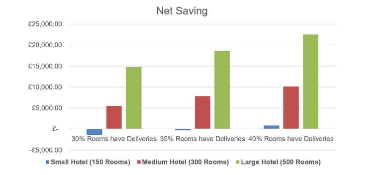 Our net savings calculations are based on a comparison with a minimum wage worker, freeing up their time to perform higher value customer facing tasks. Although the comparison shows a net cost for smaller hotels, these locations probably don’t have to staff available to perform 24/7 room service. Our robot removes the need for food delivery personnel to enter the hotel, creating a more secure environment and provides a new revenue stream from F&B. Any direct costs would be easily eclipsed by indirect revenues, customer satisfaction and staff productivity improvements.